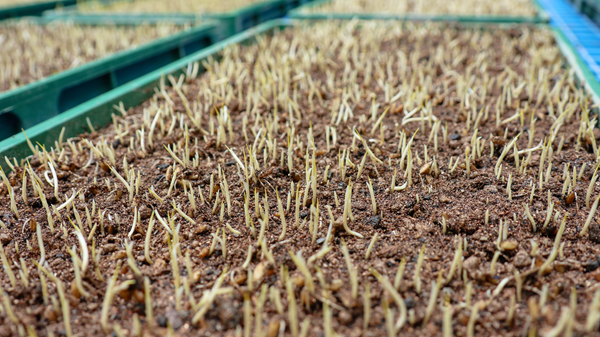 在育秧工廠內(nèi),一條機(jī)械化流水線設(shè)施貫穿車間,車間工人只需要將催芽框放置在履帶之上,即可實現(xiàn)自動填土、播種、藥劑消毒等一系列操作,隨后用平板車將催芽框轉(zhuǎn)移至恒溫恒濕培養(yǎng)室,靜待數(shù)日,即可得到生機(jī)盎然的新生嫩芽。