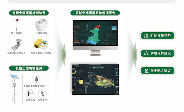 在土地平整、農(nóng)田整治的基礎(chǔ)上,利用耕地質(zhì)量監(jiān)測智能化裝備與土壤傳感器體系采集土壤理化相關(guān)指標、土壤含水量、區(qū)域農(nóng)業(yè)氣象等數(shù)據(jù),實現(xiàn)田間地情、肥情、環(huán)情、墑情的監(jiān)測分析。聯(lián)動應(yīng)用區(qū)域土壤質(zhì)量跟蹤管理平臺,為耕地監(jiān)管單位建立數(shù)字化管理體系,實現(xiàn)高標農(nóng)田耕地質(zhì)量的長效化、動態(tài)化、智能化監(jiān)測與管理。