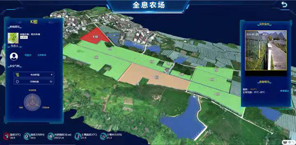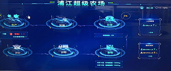 作為智慧農(nóng)業(yè)的升級版本,“超級農(nóng)場”項目對生產(chǎn)經(jīng)營管理等每一個環(huán)節(jié),都進行了嚴格的監(jiān)管,數(shù)據(jù)采集,實時監(jiān)測。通過無人機的航拍,實現(xiàn)了對整個農(nóng)場的3D建模,把整個農(nóng)場分成A—K,差不多11個區(qū)塊,然后進行區(qū)塊的數(shù)字化監(jiān)控。一塊電子顯示屏就可看到農(nóng)場的所有狀況,葡萄園11個鋼架大棚所有環(huán)境信息,包括溫度、濕度、土壤酸堿值、光照等情況都呈現(xiàn)在屏幕上。另外,葡萄園里各處分布了多少攝像頭,有多少在職人員,多少外來人員,也都能一目了然。
