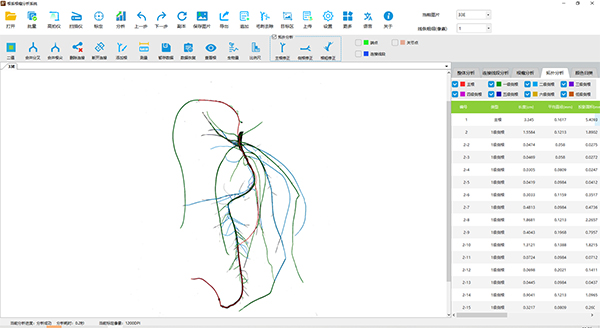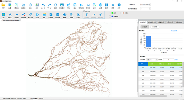 分段測(cè)量:通過直徑、投影面積、表面積、體積和長(zhǎng)度進(jìn)行根系分段和分檔,自動(dòng)測(cè)量各直徑段長(zhǎng)度、投影面積、表面積、體積等,及其分布參數(shù),并輸出數(shù)據(jù)直方圖,實(shí)現(xiàn)數(shù)據(jù)可視化。