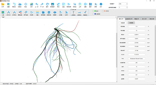 拓?fù)浞治觯?/strong>自動(dòng)進(jìn)行根系拓?fù)浞治?,自?dòng)確定根的連接數(shù)、長(zhǎng)度、體積等參數(shù),可自動(dòng)區(qū)分側(cè)根等級(jí)自動(dòng)分析主根或任意一支側(cè)根的參數(shù)等。