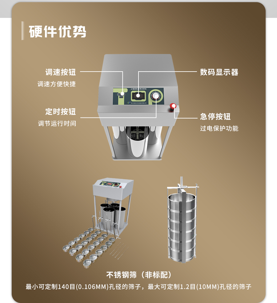 土壤團(tuán)聚體分析儀低噪音,可調(diào)速;帶有定時(shí)設(shè)置功能,運(yùn)行時(shí)間數(shù)碼管顯示,無級(jí)調(diào)速功能;同時(shí)帶有應(yīng)急暫停開關(guān),方便試驗(yàn)中出現(xiàn)異常及時(shí)斷電,停止工作。具有漏電保護(hù)功能。