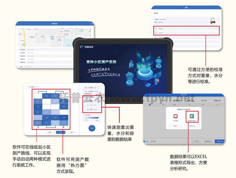 1、測產(chǎn)軟件操作簡單,帶多點水分曲線校準(支持用戶自行校準)、重量校準及細節(jié)參數(shù)的設置;