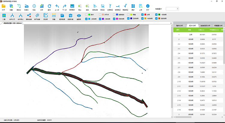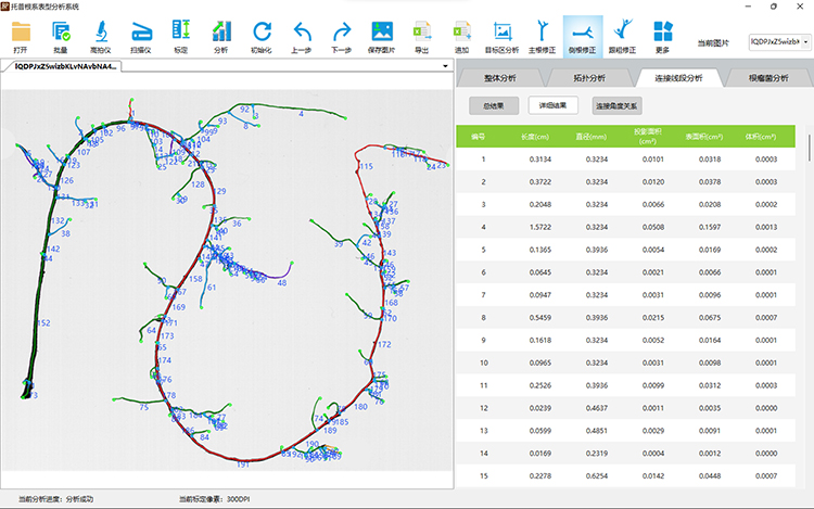 根系連接分析參數(shù):分支角度、連接數(shù)量、各段詳細參數(shù)等