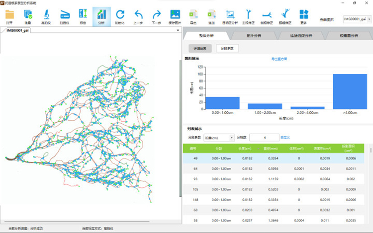 一鍵分析多項參數(shù):一鍵操作,精準(zhǔn)獲取根總數(shù)、根尖數(shù)量、根總長、根平均直徑、根總投影面積、根總體積、R/G/B、RHS、總連接點數(shù)、端點、關(guān)節(jié)點、連接點數(shù)、分叉數(shù)、交疊數(shù)、盒維數(shù)等多項參數(shù);