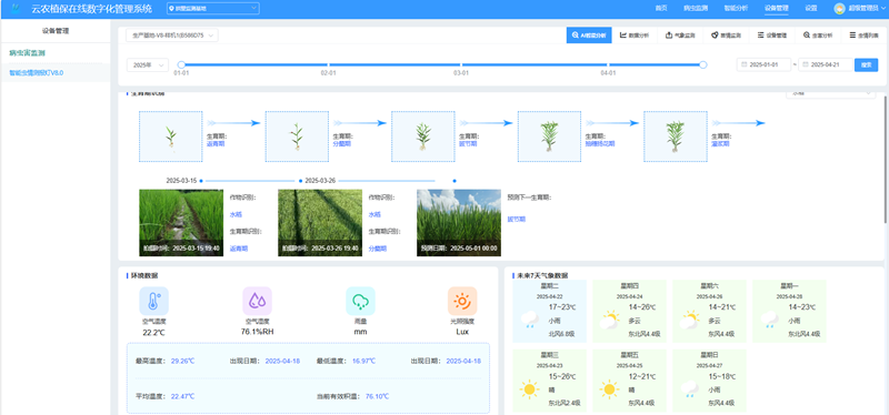 2、智能識別作物生育期:高清苗情攝像頭搭配算法模型,智能識別水稻等作物生育期。